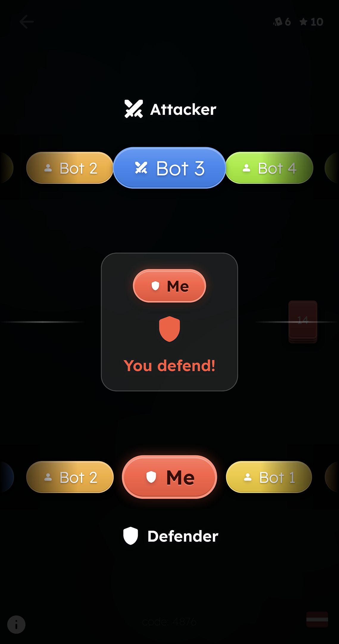 Attackers and defenders pick their cards without knowing the opponent's choice, and the highest score wins.